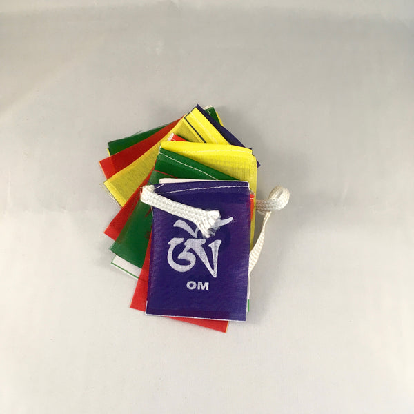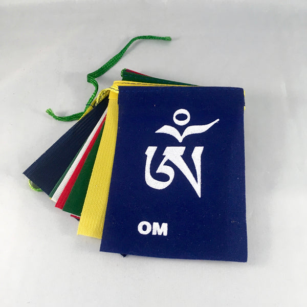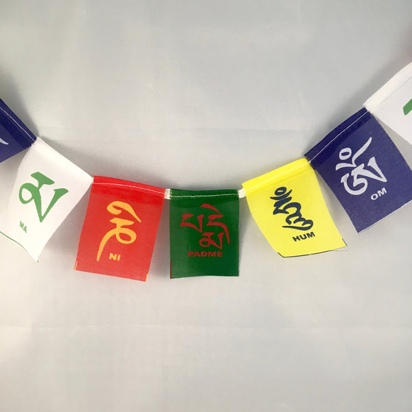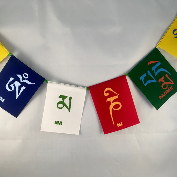 This quality material prayer flag contains a string of multi coloured flags (representing the 5 Buddha families), each with a syllable, in Tibetan and English, that spells the mantra of...