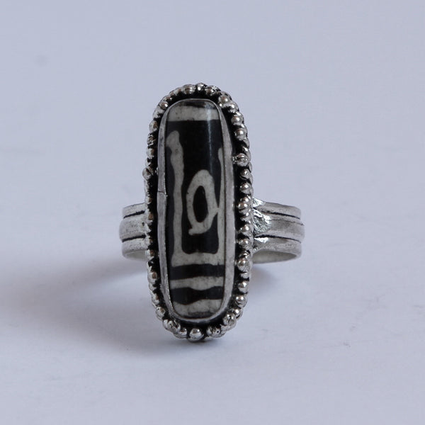 A dzi or sheep-eye stone is one of the most prized stones in Tibet. This of course is an imitation, yet it reminds us of the radiance of power and...